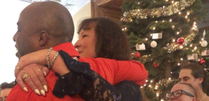 After dinner, I invited Santa to come to the tree and they began randomly selecting ornaments (with their aforementioned nametags) and announcing these as “winners” of a prize: the first winners won the center piece wreaths, then Santa selected the winners of the large wreaths and poinsettias decorating the staircase, and finally the grand prize winner was selected — Kathryn Davis the ED for the Trans Chorus was shocked when her name was read aloud by Santa, she had won the 11 foot Christmas tree!