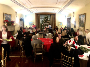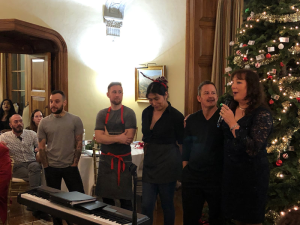 … the side doors to the Salon were flung open by the directors of the Chorus; Artistic Director Abdullah Hall & Executive Director, Kathryn Davis, as the Chorus was humming carols. The guests intrigued, filed into the dining room decorated with more wreaths, and formal place settings. The seating was arranged so that each guest found their name at these settings on a Christmas ornament. Then the Chorus’s humming blossomed into beautiful singing of more Christmas carols.